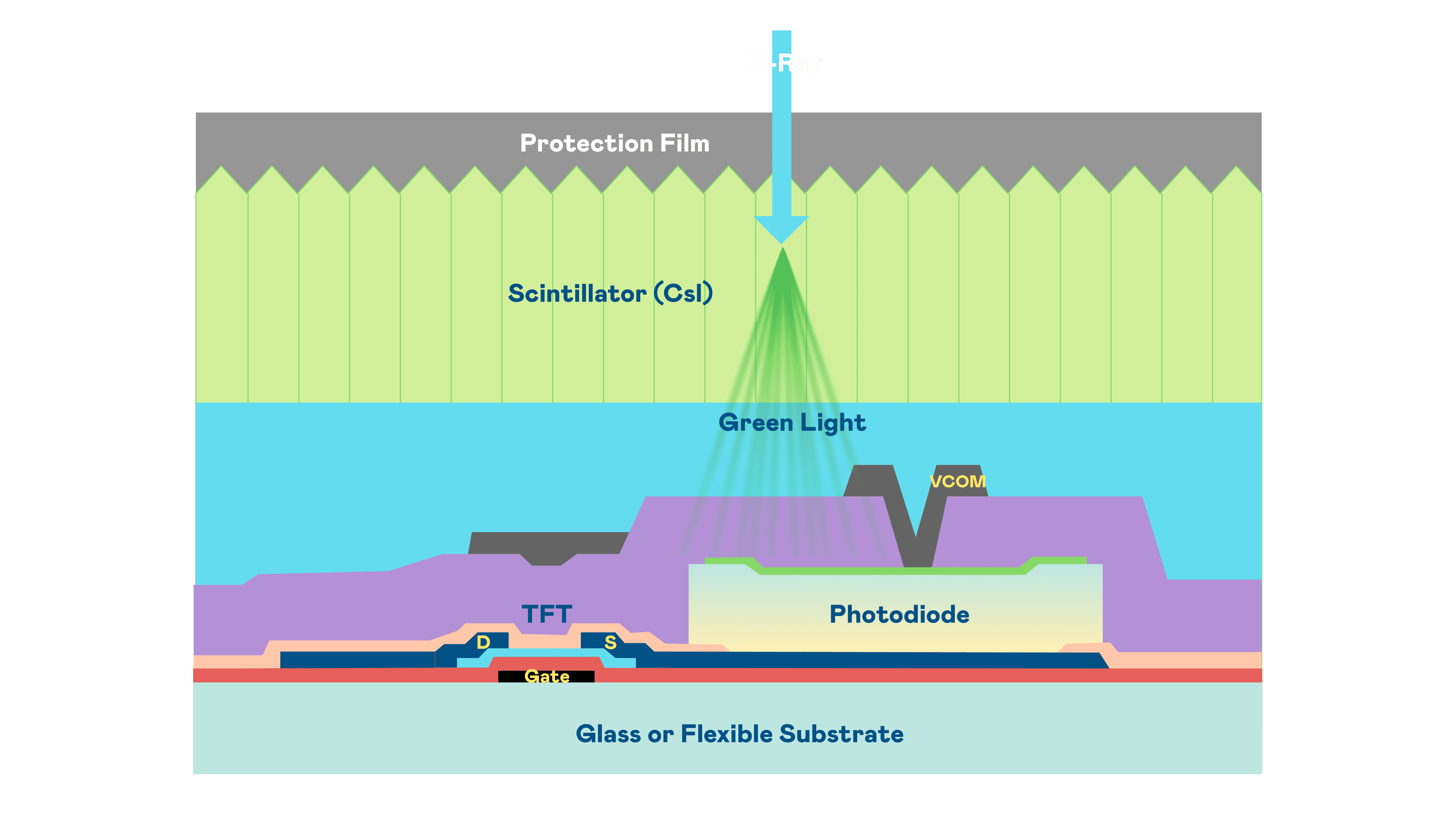 杏悦2的X光影像感测阵列使用薄膜电晶体 (TFT) 作为每个像素的读取开关,,搭配光电二极体(Photodiode)的光电转换元件,,用以感测X光影像讯号。。。。